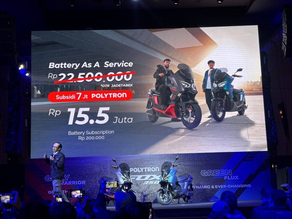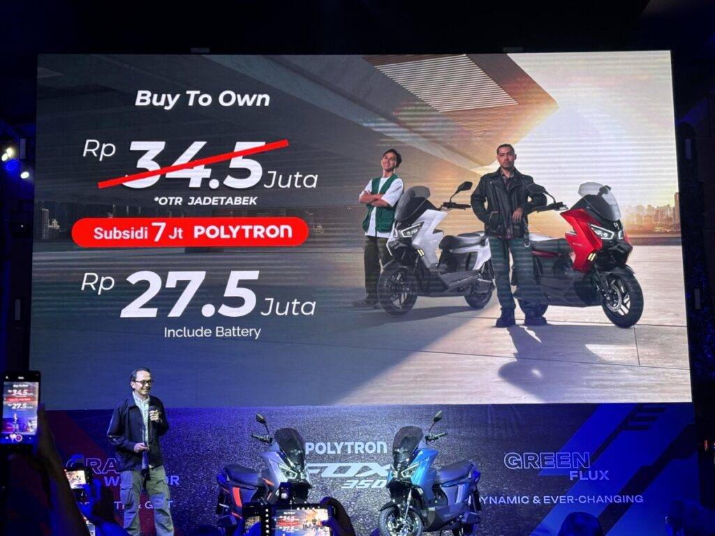 Untuk memberikan fleksibilitas, Polytron menawarkan dua skema pembelian: Battery Subscription And Buy-to-Own. Pada skema langganan, harga FOX 350 dibanderol Rp22,5 juta. Namun dengan subsidi Rp7 juta, harga OTR Jadetabek menjadi Rp15,5 juta. Melalui biaya langganan baterai Rp200 ribu per bulan, pengguna mendapat garansi baterai seumur hidup selama berlangganan.